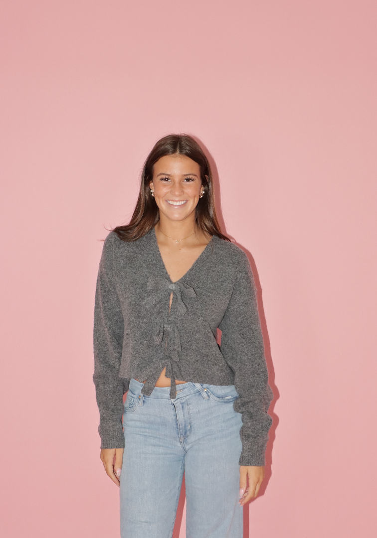 The Willow Bow Sweater is a cozy knit with a v-neck and a ribbon bow trim. You can wear it two ways—with the bow in front or in back—for a fun, playful look.