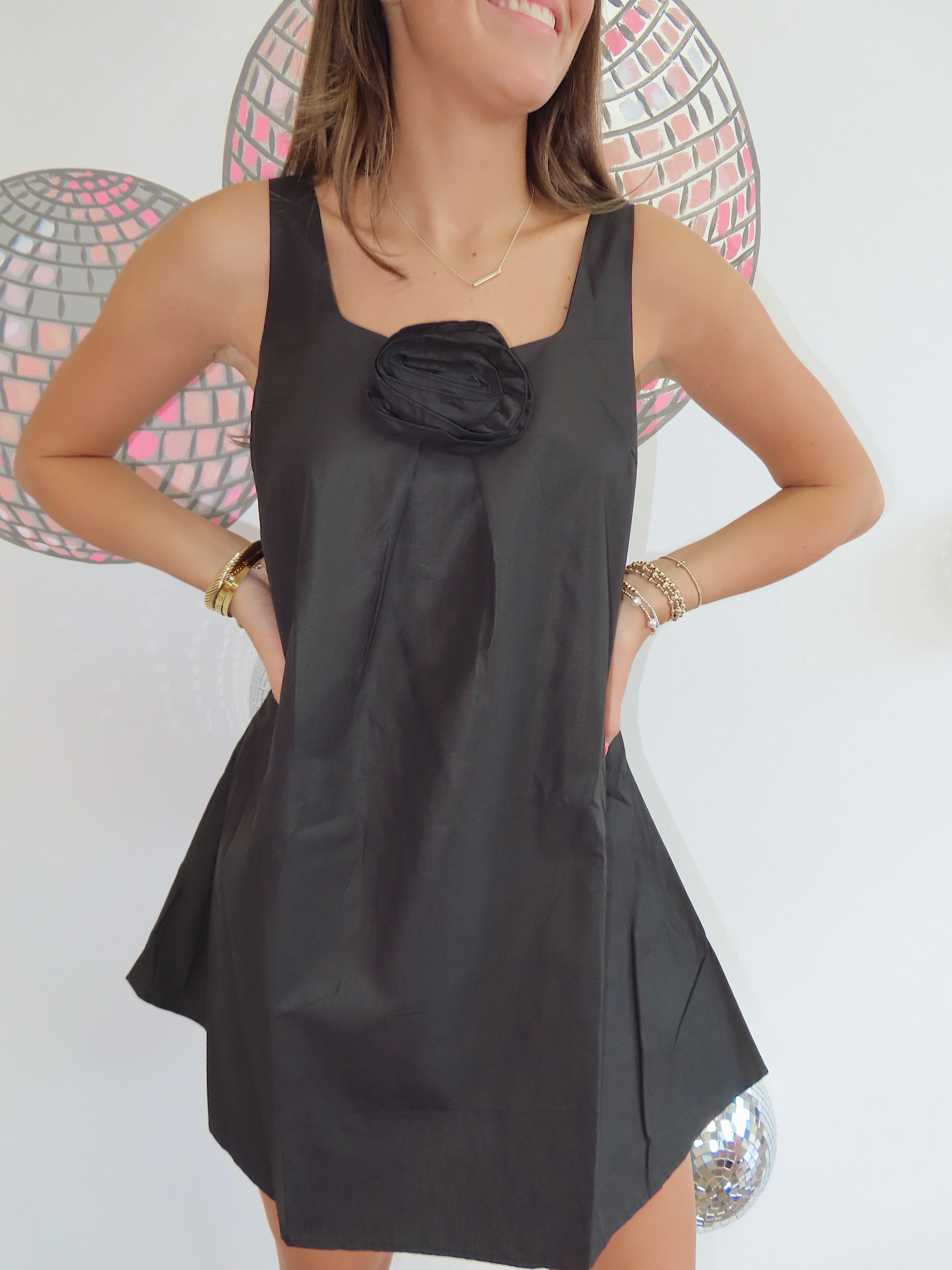 The Isabelle Mini Dress combines a playful A-line shape with wide straps and a chic square neckline. A front pleat detailed with a 3D floral adds fun texture, while a concealed back zipper keeps the look sleek.